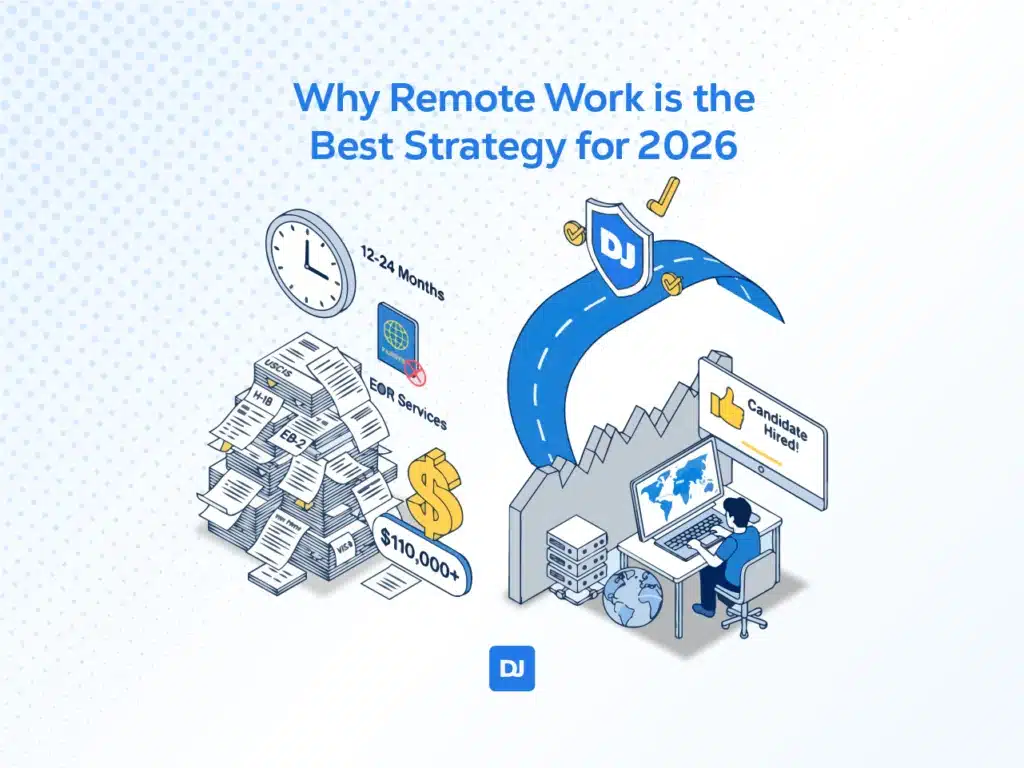 With stricter Department of Labor (DOL) scrutiny in 2026 regarding the impact of immigrants on local wages, remote work offers a simpler path. DistantJob acts as the legal employer (through EOR), dealing with taxes, benefits, and local compliance. Your company can focus on results without worrying if the employee will be stopped at the border or have a Green card denied.