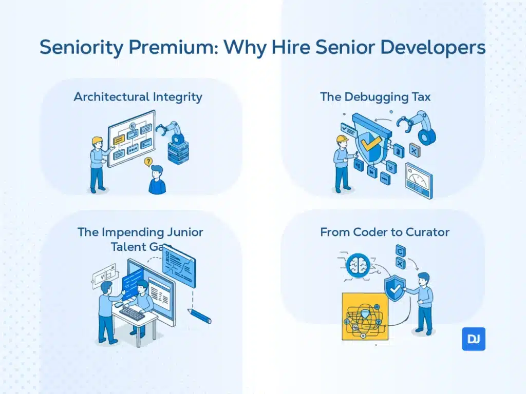 There is a critical paradox: as AI’s ability to generate code increases, Senior Developers’ value is actually skyrocketing. To elaborate further, we can break down the “Seniority Premium” in the age of AI into four key dimensions: Architectural Integrity, The Debugging Tax, The Junior Pipeline Crisis, and The Shift from Coder to Curator.