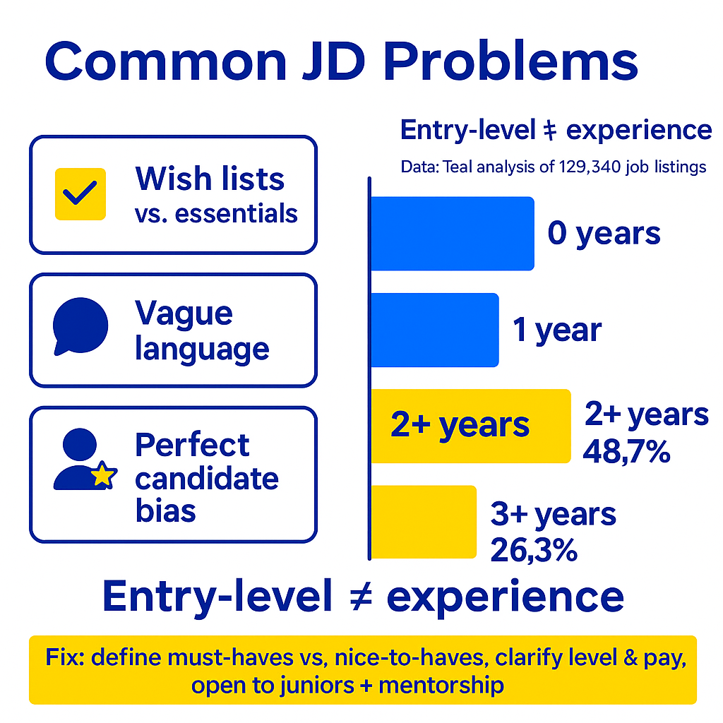 According to their study, nearly half (48.7%) of entry-level job postings require at least two years of experience, while 26.3% require 3+ years. The job market is trying to hire seniors at an entry-level salary.