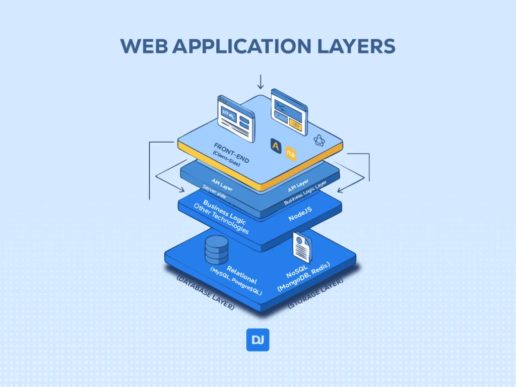 A standard web application is composed of three primary layers: Front-end, Back-end, and Database.