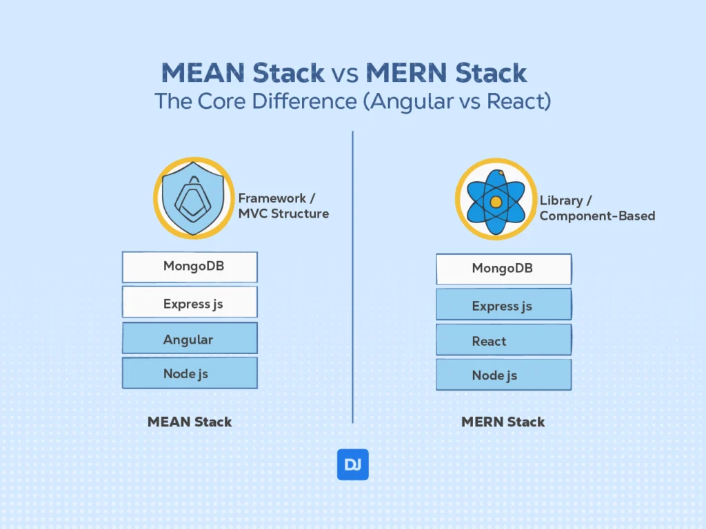 MEAN and MERN are both full-stack JavaScript stacks that enable you to build an entire web application with one language. However, they differ in the choice of front-end framework (Angular vs React) and thus in developer experience.