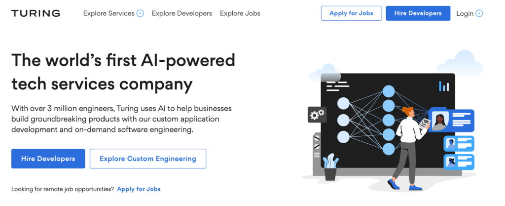 Pricing: Turing does not charge upfront costs. However, when it comes to their pricing, they don’t specify on their website.