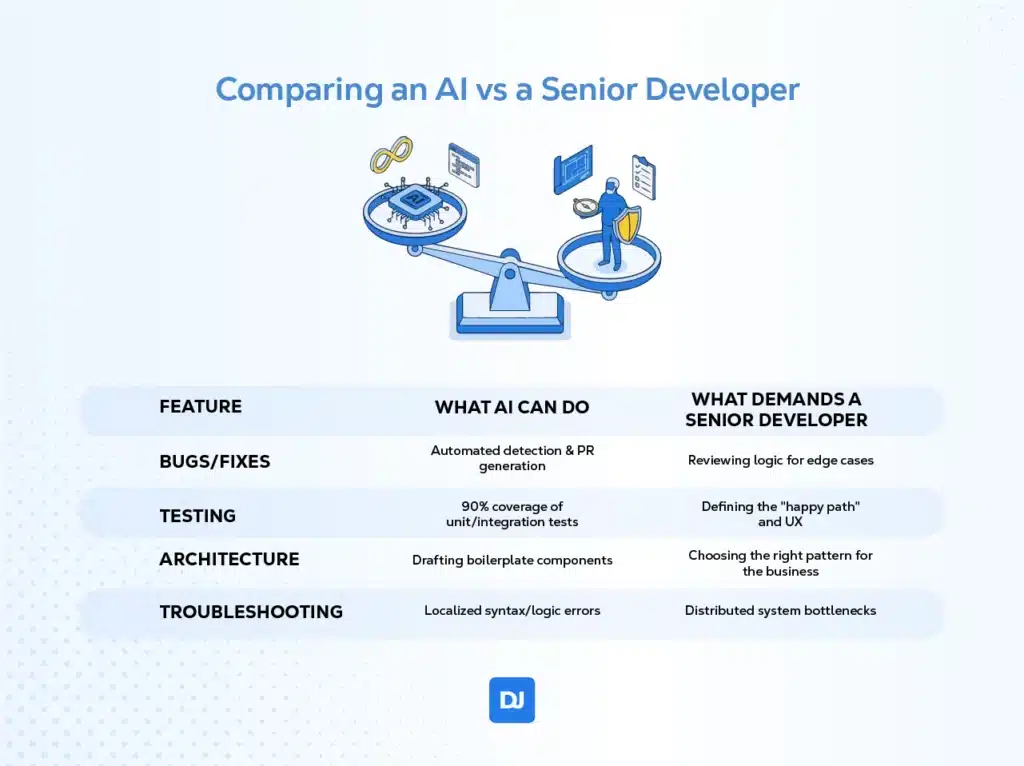 This article breaks down exactly what AI can handle in your development workflow, and the five critical areas where only a senior developer can make the call.